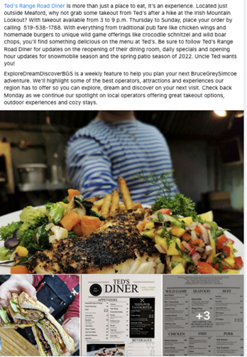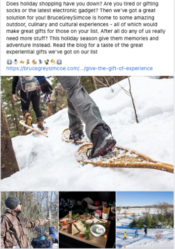 BruceGreySimcoe Instagram feed. Engagement, shares and reach on these posts have been impressive. One Facebook/Instagram post we did recently, supported with a $50 advertising buy, received 460 reactions, comments and shares and a reach of 70,660. Not a bad return on a $50 spend.