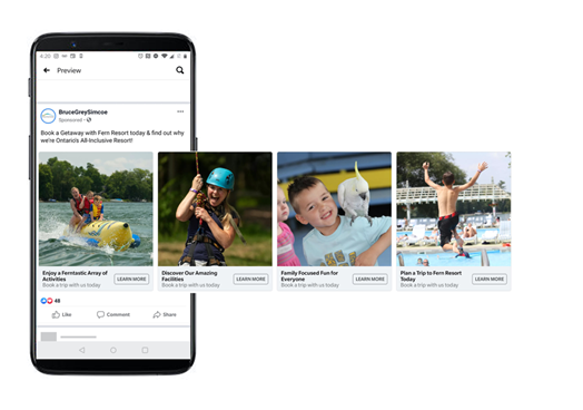 The shots are from a photo shoot Fern Resort did in 2018. RTO7 then used these images in a carousel in our BruceGreySimcoe SpringSummerFall 2019 Facebook/Instagram Image Campaign. $750 was budgeted to run this campaign through the BruceGreySimcoe Facebook page, with all traffic directed to Fern Resort’s website.