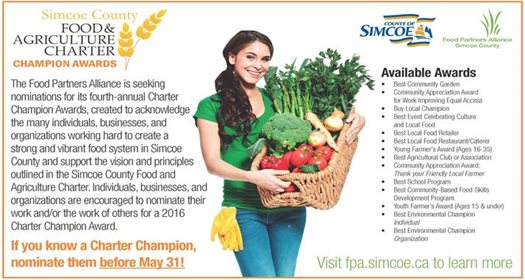 Nominations Now Open for Charter Champion Awards Posted by Ginny Henry | March 07, 2016 | 2016, BruceGreySimcoe, Charter Champion Awards, Food Partners Alliance, nominations, RTO7, Simcoe County The Food Partners Alliance is pleased to announce that nominations for fourth annual Simcoe County Food & Agriculture Charter Champion Awards are now open. For more information, visit http://fpa.simcoe.ca